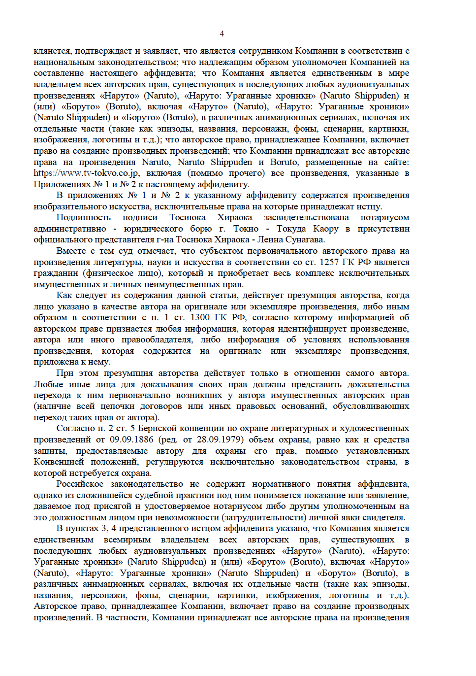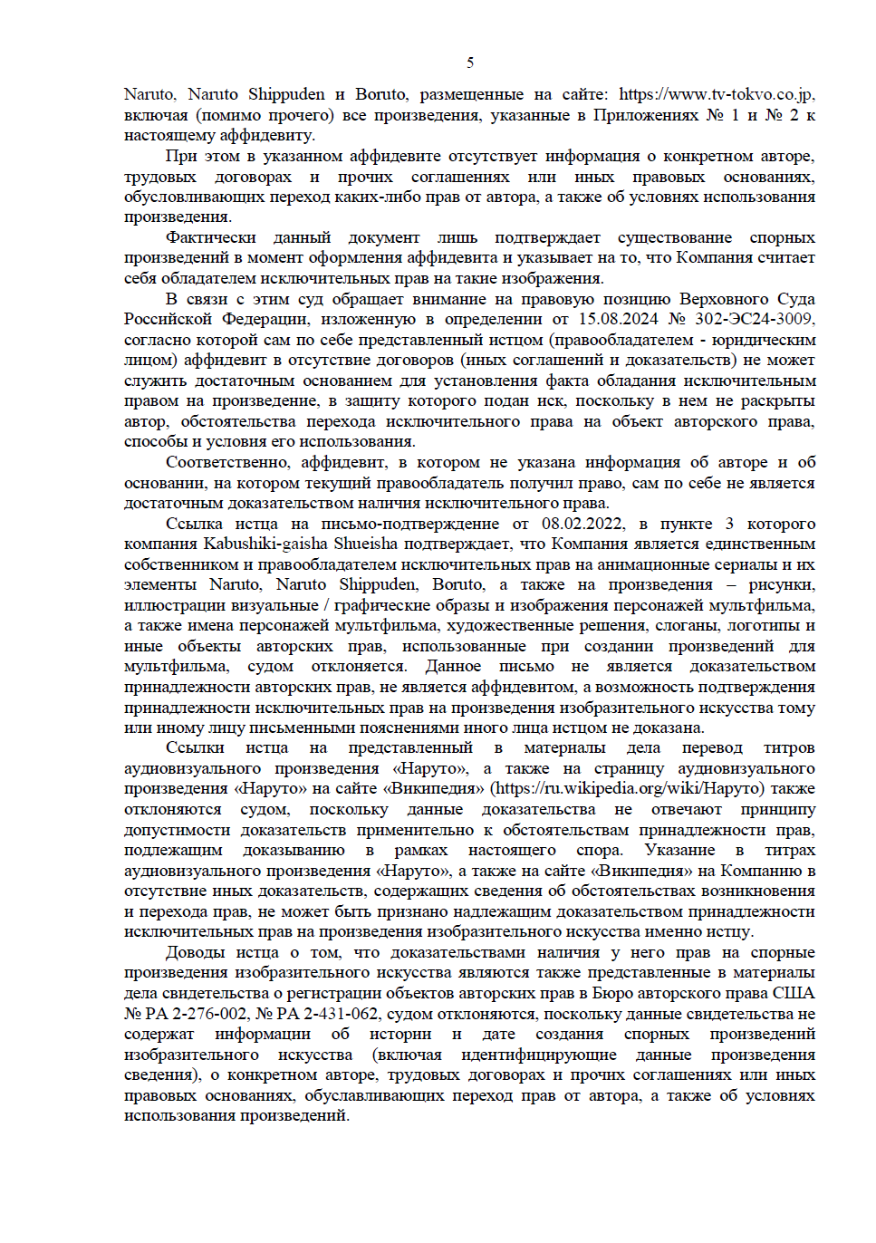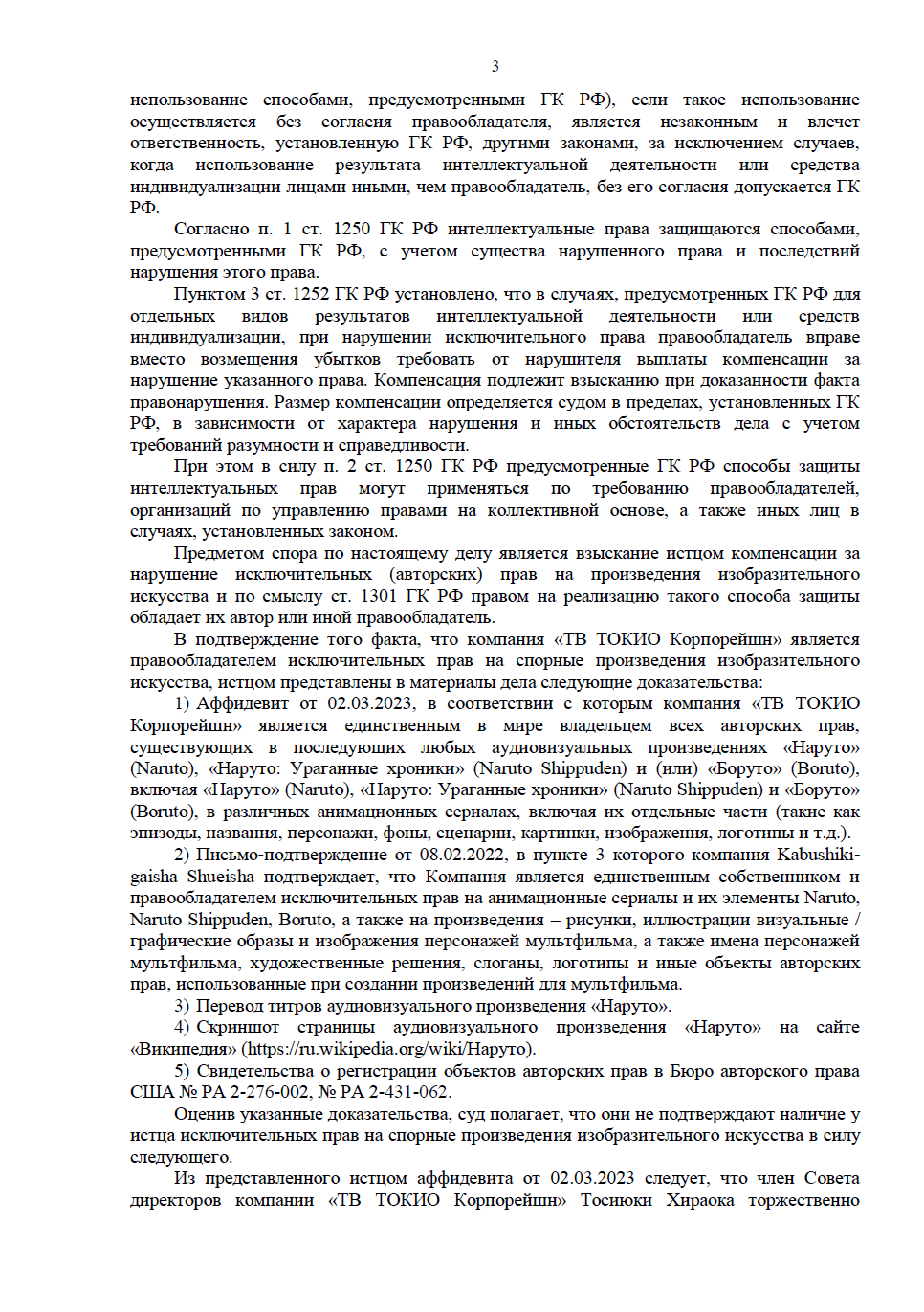 • Недостаточность доказательств права собственности. Истец предоставил аффидевит (заявление под присягой), письмо от партнёрской компании, скриншоты из «Википедии» и американские свидетельства о регистрации. Суд, вслед за нашей позицией и ссылаясь на практику Верховного Суда РФ, установил, что ни один из этих документов не подтверждает цепочку перехода прав от конкретного автора (художника) к японской корпорации. В них не указаны имена авторов, нет трудовых договоров или лицензионных соглашений – ключевых для российского суда документов.