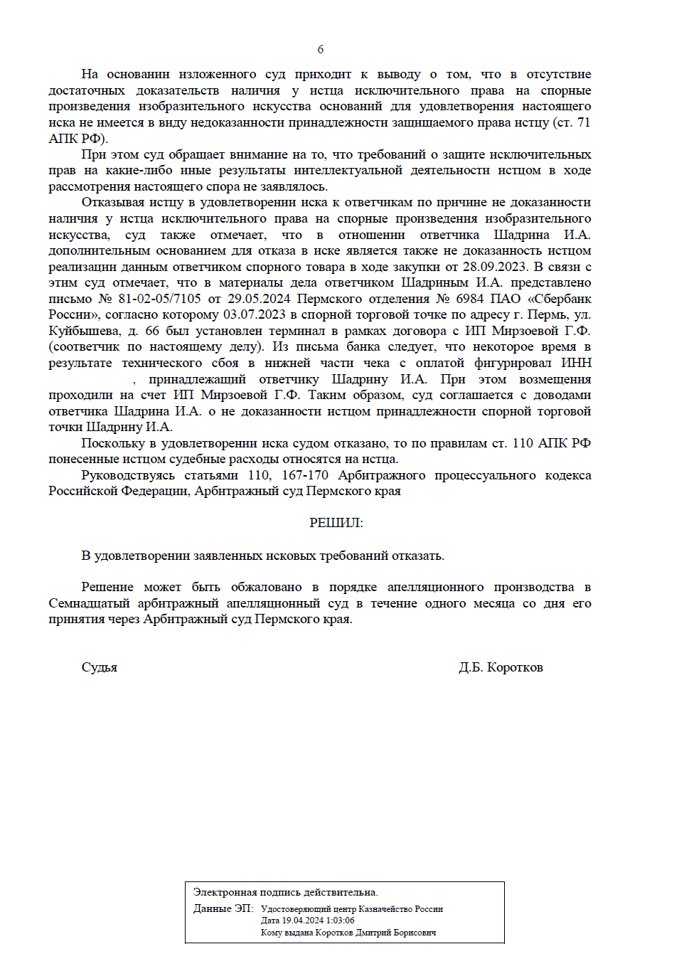 • Отсутствие доказательств нарушения именно нашим клиентом. Мы представили суду документы от банка, которые подтвердили, что платёжный терминал в торговой точке, где была совершена закупка, был зарегистрирован на второго ответчика. Чек с ИНН нашего клиента оказался результатом технического сбоя, а все поступления шли на счёт другого предпринимателя. Таким образом, связь нашего клиента с продажей спорного товара не была доказана.