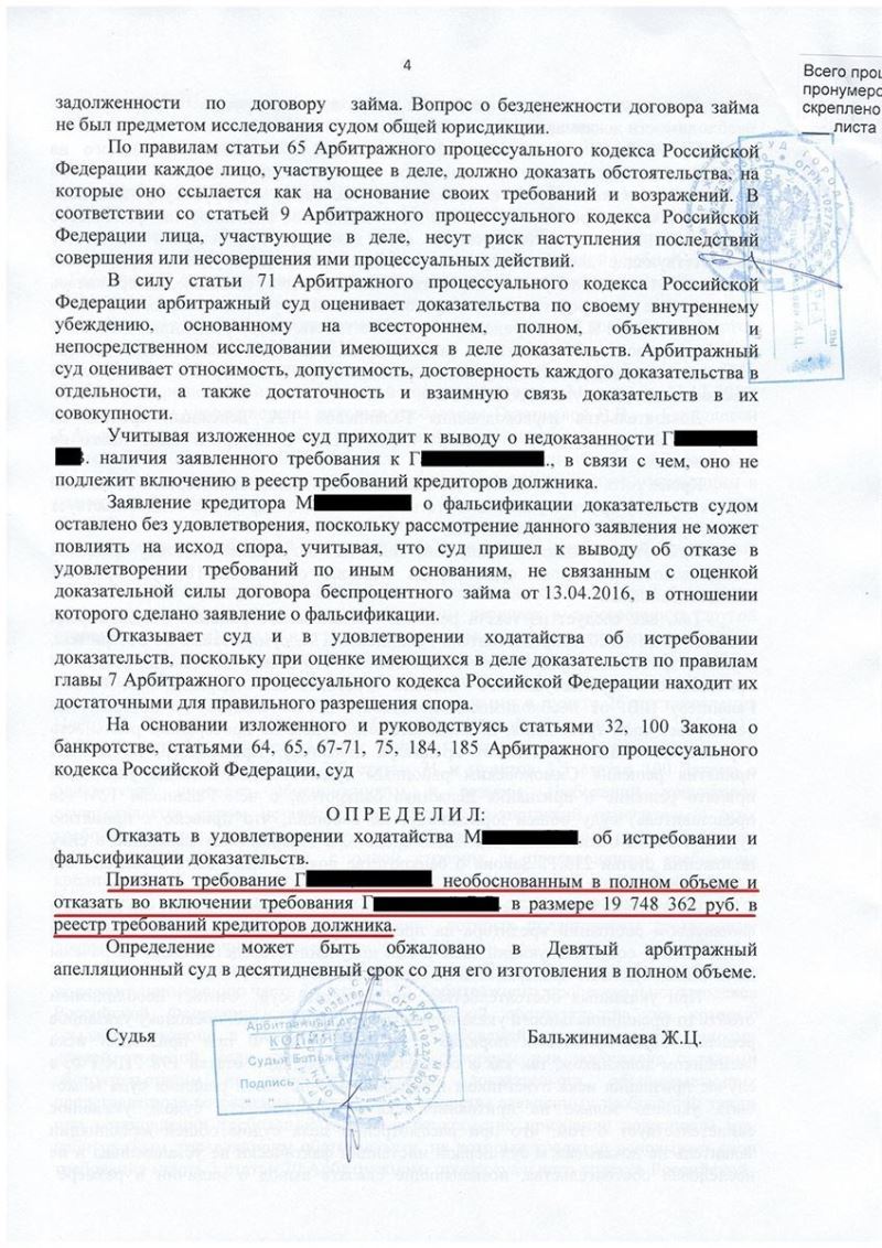 В деле о банкротстве гражданина было подано заявление кредитора о включении требований на основании договора займа, расписки и решения суда на сумму 295 000 долларов США, что на момент обращения составляло 19 748 362 рубля. При удовлетворении данных требований клиент понес бы существенные убытки.