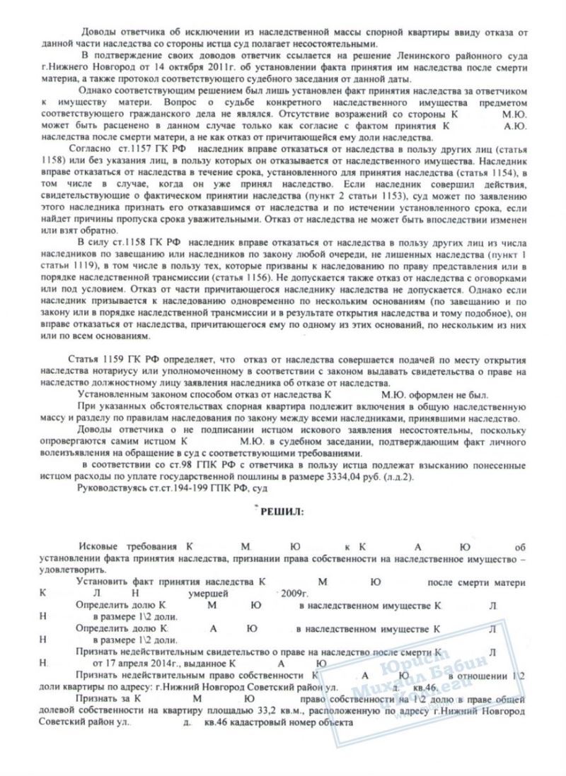 При участии в деле юриста, сложный наследственный спор был разрешён судом в пользу нашего клиента. За К. было признано право СОБСТВЕННОСТИ на 1/2 квартиры.