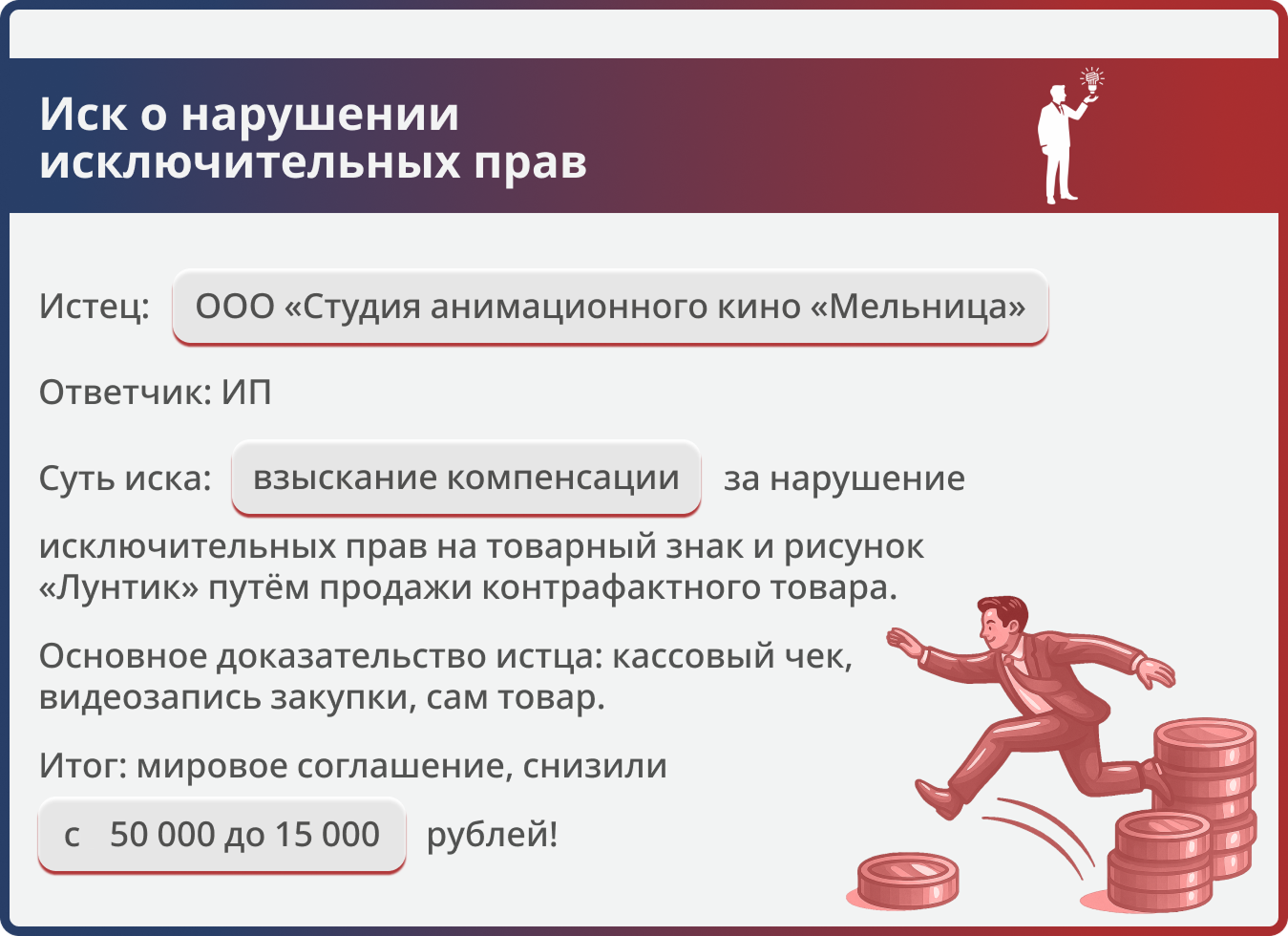 Правообладатель требовал компенсацию за нарушение прав на товарный знак и изображение «Лунтик». Юристы компании инициировали переговоры и подготовили мировое соглашение, по которому компенсация снижена более чем в 3 раза — до 15 000 руб.