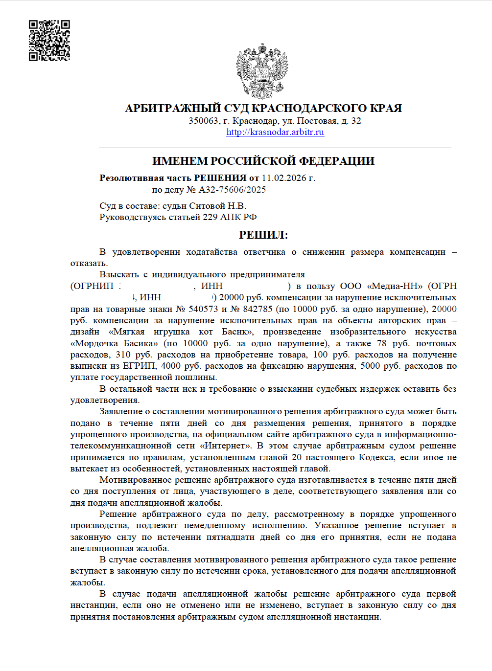 Истец (ООО «Медиа-НН») обратился в суд с иском к индивидуальному предпринимателю Амбарджная Акопу Григорьевичу о взыскании 80 000 руб. компенсации за нарушение исключительных прав на два товарных знака, а также на объекты авторских прав — дизайн «Мягкая игрушка кот Басик» и произведение изобразительного искусства «Мордочка Басика». Основанием послужила реализация ответчиком товара, содержащего указанные обозначения.