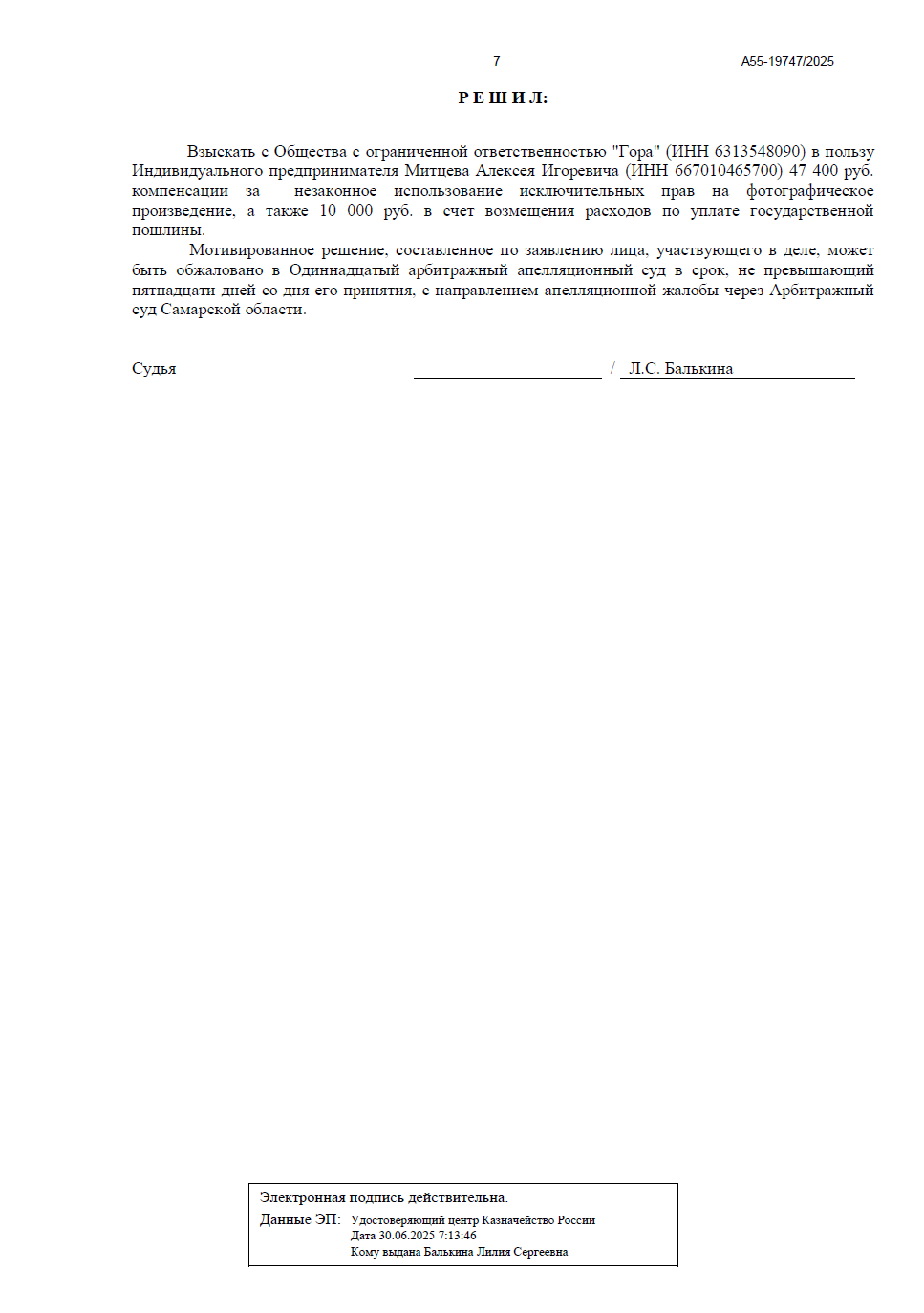 • Техническое подтверждение авторства: суду был представлен полноразмерный файл в формате RAW и скриншоты метаданных, подтверждающие создание фото именно Гарифуллиным в 2017 году.